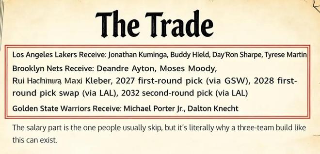 篮网得到:艾顿、穆迪、八村垒、克莱伯、2027年首轮签(来自勇士)、2028年首轮签互换权(来自湖人)、2032年次轮签(来自湖人)