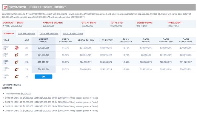 亨特还余下两年4800万的合同,身高2.03米,年龄29岁,本赛季场均13.5分4.1篮板2.2助攻0.61抢断0.16盖帽,命中率41.7%,三分命中率30.7%,他在骑士的定位是锋卫摇摆人,虽然他本赛季效率不佳但他却是湖人最急需的三号位。
