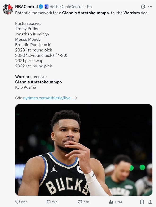 美媒PH透露,勇士队在报价扬尼斯的过程中最多可以送出四个首轮签:2026年、2028年、2032年(三个不保护)、2030年(前20顺位保护)的首轮签。