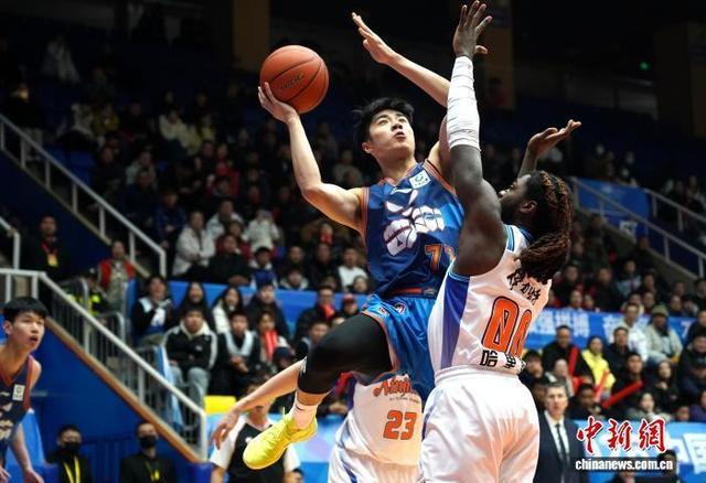 四川男篮队员景菡一(蓝衣)得到全队最高的14分,在比分落后时扛起了球队进攻重任。记者 吕杨摄