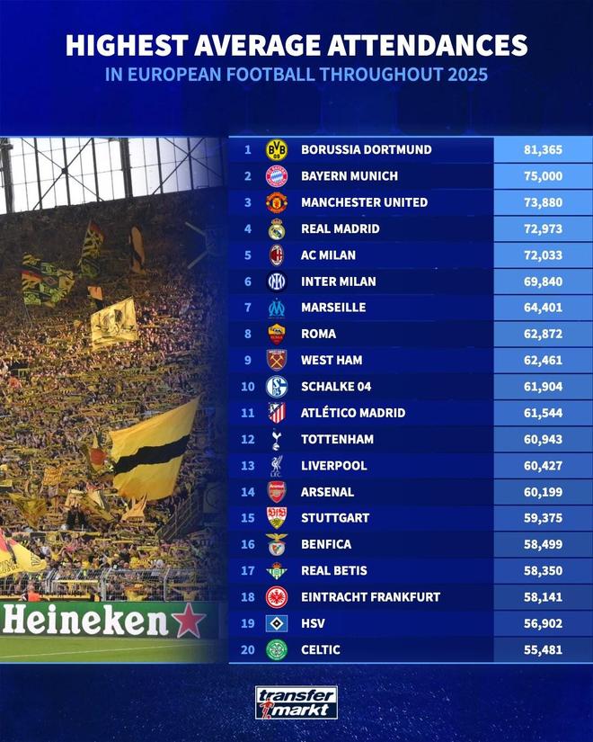 12月29日,德转发布了2025年欧洲俱乐部场均上座榜,多特以场均近8.1万人的上座人数稳居榜首,拜仁与曼联则紧随其后。
